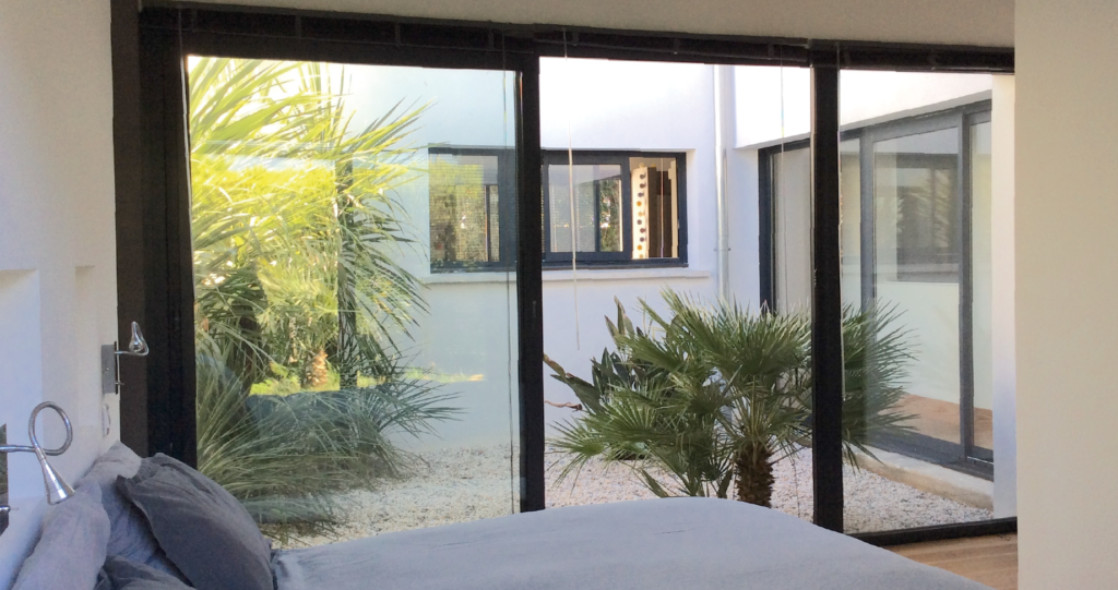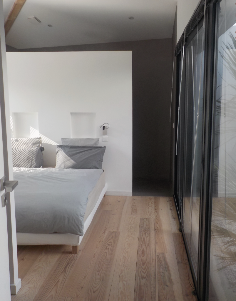 Inscrit dans son contexte végétal existant, la deuxième extension au nord qui s’articule autour de deux chambre et salle de bain recrée un autre petit jardin sous forme de patio, permettant de faire rentrer la nature en fonds de parcelle. Cette vue végétale permet d’éclairer le nouveau couloir de distribution qui longe l’ancienne façade nord, les nouvelles chambres créées, de contribuer à une ventilation naturelle et efficace pour les mois les plus chauds et de faire entrer un jeu de lumière variable et tamisé selon les heures de la journée.