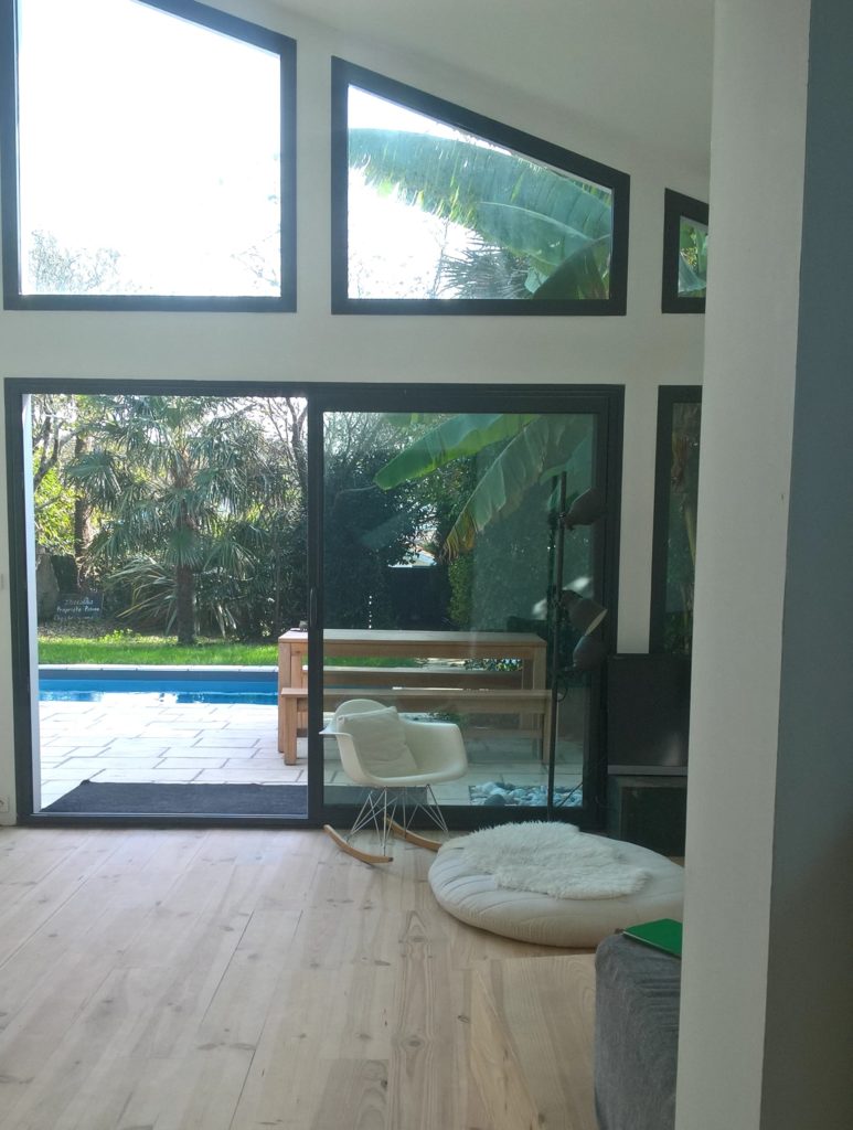 La première extension est réalisée plein sud sous forme d’un volume global de 40 m2 sous charpente qui accueille les fonctions de salon, d’étude et de détente : la vue vers le jardin luxuriant est retravaillée sous forme de façade entièrement vitrée, grâce à une structure poteaux/poutre en béton armé. L’orientation sud de cette façade permet de bénéficier d’un réchauffement naturel du bâtiment l’hiver lorsque les rayons du soleil sont bas tout en conservant une température agréable et tempérée l’été, les rayons étant au plus haut.