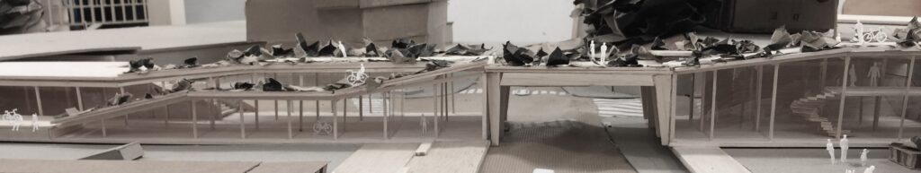 Pour retrouver une échelle de proximité, notre intention est de lier cette séquence horizontalement, par un parc de mobilités, une architecture paysagère intégrant une programmation hybride compsoée d’aires outdoor et indoor de skate, une galerie street art, un atelier de réparations dédié aux nouvelles mobilités et un tiers lieu café/bookstore. Cette programmation qui articule une séquence extérieur/intérieur fait revivre cette place comme un trait d’union cimentant les énergies des arrondissements et villes limitrophes, pour générer un mieux vivre ensemble.